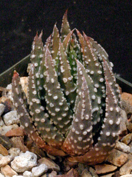 This variant of Haworthia pumila has doughnut-shaped tubercles on the leaves. The rosettes are fairly tight but the plants are robust, forming very nice individuals. These plants are seedlings in 5-inch pots.