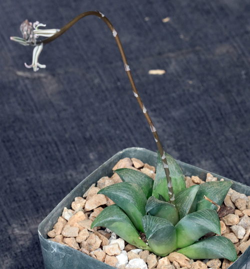 This form of Haworthia retusa has relatively large, dark-green rosettes that dont seem to offset very much. Like the typical small forms of this species, the leaves have faint lines that form windows. These plants are seedlings in 5-inch pots.