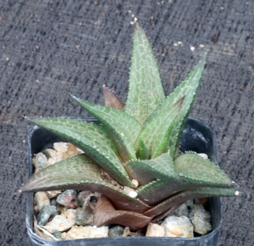 This is one of the most widespread of the Haworthia species in South Africa, occurring over most of the Great Karoo and the Klein Karoo of South Africa. The rosettes of this variety have leaves with tessellate (square-shaped) markings that are rather striking. These plants are rooted offsets in 2-inch pots.