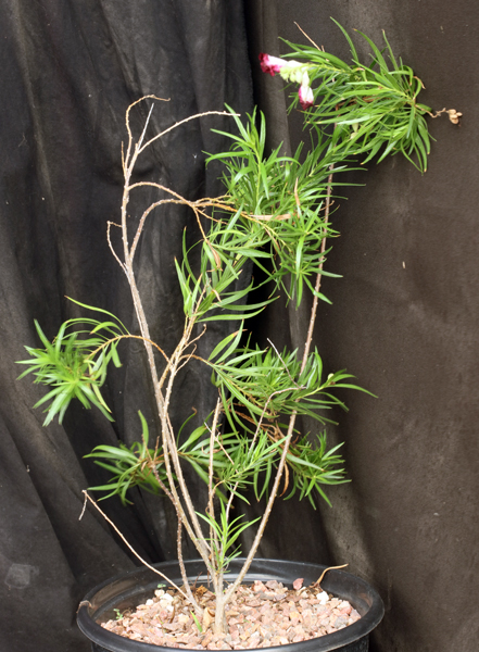 This species is a cultivar of a common species of the Sonoran Desert in Arizona and California. It is a deciduous tree with smooth gray bark, spineless branches, and lanceolate leaves. The flowers are burgundy colored and showy. These plants are seedlings in 2-gallon pots.