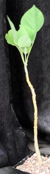 This Erythrina is from Madagascar and Comoros northwest off Mozambique. It is a huge tree with black spines on the gray-green trunk, and it has very large ovate leaves. These plants are seedlings in 5-inch pots.