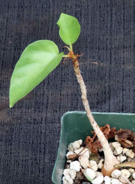 Widely distributed from Baja California to Sonora south to Oaxaca, Mexico, this beautiful pachycaul tree typically is associated with riparian settings. Here, we accept the lumping of the previously recognized Ficus petiolaris and F. palmeri, and these plants likely were in the latter group, generally lacking red veins in the leaves. Often, this species hangs from cliffs, dipping its extremely long, white roots into permanent water. This is a classic plant for either bonzai or for perching on a rock, draping the roots over the sides and into the soil beneath. These plants are rooted cuttings in 4-inch pots.