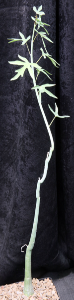 From Yemen and East Africa (Somalia through Tanzania), this species has a conical caudex up to three-four feet tall. The leaves are deeply lobed, and the flowers of this dioecious species are small and cream colored. The fruit are striped with two shades of green. The woody vines arise from the caudex; we recommend trimming the vines, not the caudex, of this species. We offer seedlings of this species with caudices 1-2 inches across in one-gallon pots.