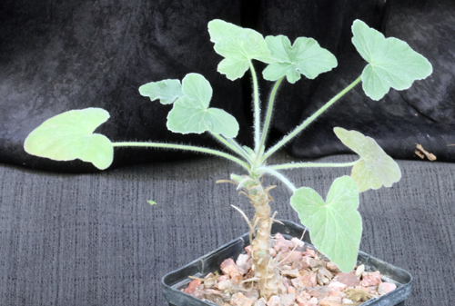 This species is from East Africa. A shrub with a weak superstructure, it has a tuberous root and base that constitutes a caudex. The leaves range from gray to bright green and are generally 5-lobed. The flowers are relatively large and yellow-green with orange pollen. These plants are seedlings in 5-inch pots.