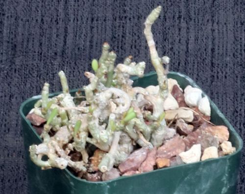 This mat-forming species mostly occurs in coastal southwest Namibia with an extension into northwestern South Africa. It is a dwarf species with short stems and pear-shaped leaves. The flowers are reddish pink and held upright. This is a winter-growing species and should be sparsely watered, if at all, during the summer months. These rooted cuttings are in 3-inch pots.