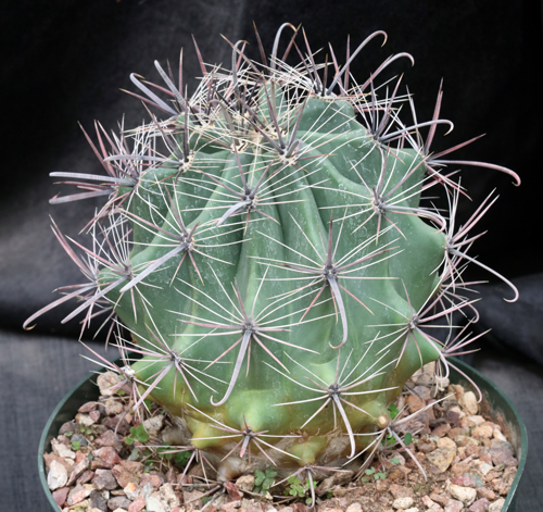 This barrel cactus is common in the northwestern parts of the Sonoran Desert, particularly in Arizona and Sonora. The plants do not offset, have numerous ribs, and feature fierce central spines with white, whisker-like radial spines. The flowers are reddish-orange. These plants are seedlings in 8-inch pots.