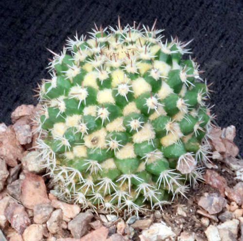 This species, from Honduras and southern Mexico, has a green globose body with rather short yellow spines on tubercles. The flowers are yellow with red highlights. These plants are seedlings in 4-inch pots.