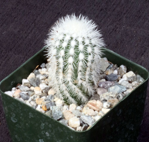 This plant, variously listed as a variety or subspecies, is part of a complex of Echinocereus that ranges from Oklahoma through Texas and into northeastern Mexico. Subspecies albispinus is distinguished with its prominent white spines on a green, offsetting body. The flowers are large and violet. These plants are seedlings in 4-inch pots.