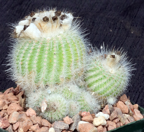 This species, which some consider to be part of the genus Parodia, is from Brazil, Paraguay, and Uruguay. These small plants have numerous ribs and a dark green body obscured by spines and dense wool originating from the areoles. The flowers are relatively large and yellow-orange. These plants are seedlings in 5-inch pots.