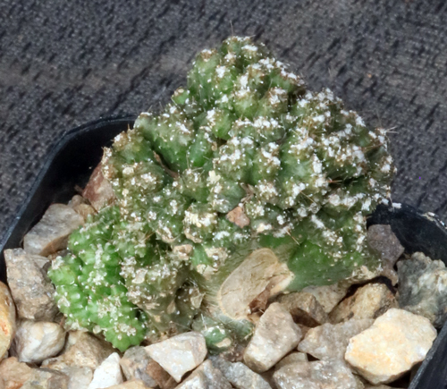 The iconic Cereus peruvianus has been moved to another genus, except here, where we keep it separate. These plants are from seed collected from a monstrose version of this species. Others have found that perhaps ΒΌ of the resultant plants are in fact monstrose. Most, however, are straight forms of this species. The flowers are typical Cereus ones, large and white with purple highlights. These plants are seedlings in 2-inch pots.