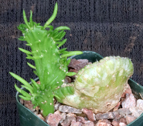 Austrocylindropuntia subulata, which some botanists consider to be Opuntia subulata, is widely cultivated in living fences in South America, and likely it originated in Peru. It has numerous cylindrical green stems with numerous yellow spines and, understandably, is effective as a living fence. These crests have fewer spines but are quite nice. These plants are rooted cuttings in 3-inch pots.