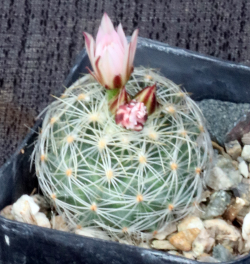 From central Mexico, this little solitary species has a flattened globose blue-green body bearing a sparse cover of spines. The flowers are reddish purple with darker streaks. These plants are seedlings in 2-inch pots.
