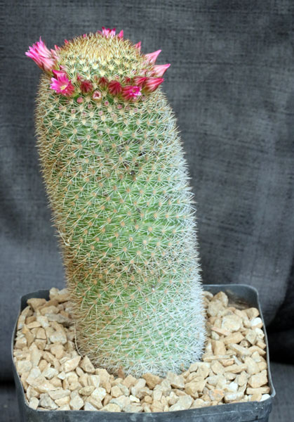 This is considered by some to be a subspecies of Mammillaria spinosissima, but these plants do not resemble each other in our experience. From an area of Guerrero, Mexico, Mammillaria pilcayensis has nearly felt like gray-yellow spines that nearly obscure a green body. This is a columnar type species with longish stems that may be upright or prostrate. The flowers are magenta to violet. These plants are seedlings in one-gallon pots.
