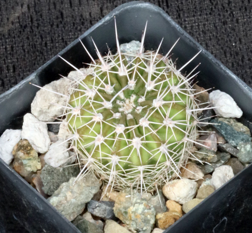 From Argentina, this species is solitary and has a globose green body with a flattened apex. It has numerous ribs and gray-black spines. We use this name instead of A. klimpelianum, the name under which this is supposedly lumped. The flowers are white. These plants are seedlings in 2-inch pots.