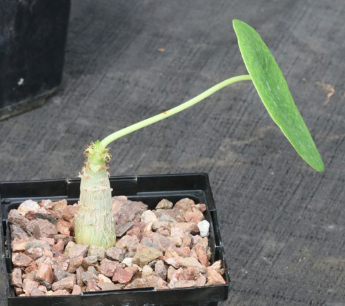 From Central America, this species is notable for its bottle-shaped trunk when young. The peltate leaves are 3-to-5 lobed and light green with a red margin and numerous small glands. These plants have yellow flowers at a small size, making an extremely attractive plant. Our plants are seedlings in 5-inch pots.