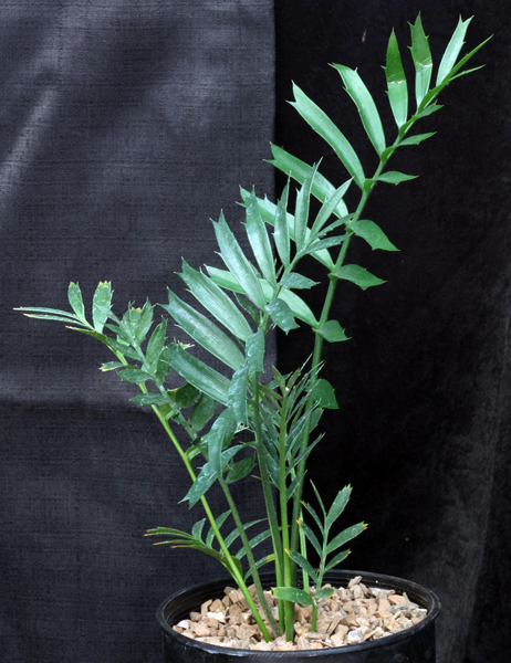 Encephalartos arenarius is a relatively fast-growing cycad from the Eastern Cape Province of South Arica. This is a species with blue-green leaves bearing large marginal spines. These plants are seedlings in 6-inch pots.
