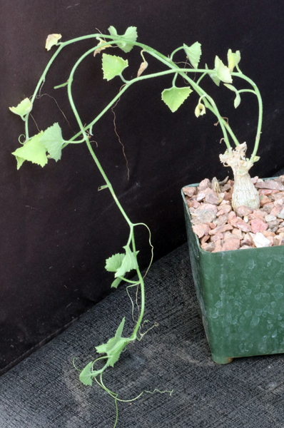 Widely distributed in Africa and Madagascar, we offer seedlings of this very nice cucurbit, which develops a thick caudex with wrinkled light gray bark and vines with hairy, palmate leaves. The fruit is a red berry. Our plants are seedlings in 4-inch pots.