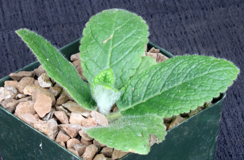 This geophyte is from Brazil. The root forms a grayish-brown flattened caudex. The leaves are ovate and are green with a blistered-like texture; the undersides have a woolly appearance. The flowers are relatively small and orange-red. We have seedlings of this species in 4-inch pots.