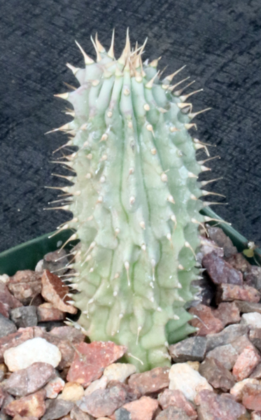 This species, the tallest in the genus Hoodia, is from northern Namibia and southern Angola. We’ve seen plants 5-6 feet tall in habitat. Although it superficially resembles other, more common species such as Hoodia gordonii, these plants should offset slowly but grow tall stems. The flowers are yellow-orange in color, are relatively small, and are star-shaped. These plants are seedlings in 4-inch pots.