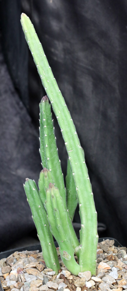 From eastern South Africa and Swaziland, this clumping species has upright, yellow-green stems that have a dull appearance, as if they were covered with fine hair. The flowers are urn-shaped and predominantly a dark purple color. These plants are rooted offsets in one-gallon pots.