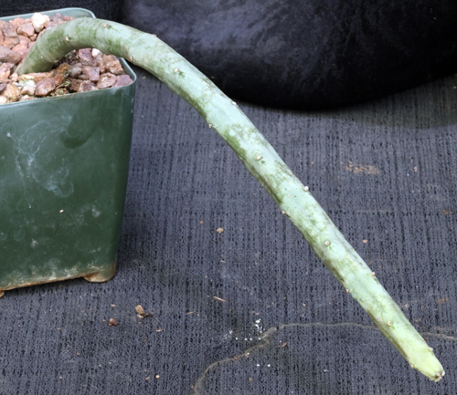 From South Africa and Swaziland, this is one very "snaky" species of Ceropegia. The stems creep and twine, possessing peduncles that grab onto convenient surfaces to hold the plant up. The flowers are dark brown and white. These plants are rooted cuttings in 4-inch pots.
