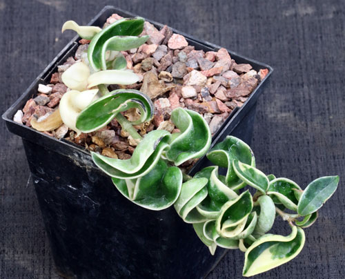 This species, widely distributed in southeastern Asia and the Pacific Islands (including Australia), is one of the most common Hoyas in cultivation. The lancheolate leaves are green and folded. The inflorescence has as many as 30 flowers, which are light purple to reddish in appearance. These plants are rooted cuttings in 5-inch pots.