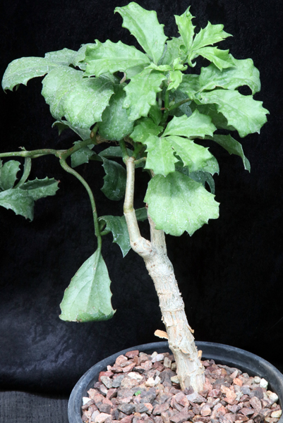 Once known as Cissus cirrhosa, this Cyphostemma is from southeastern Africa, ranging from the Eastern Cape Province of South Africa over to Mozambique and up to Zambia. With time, the caudex becomes conical up to 3-5 m tall with gray peeling bark. The leaf tips are rounded and the hairless leaves have wavy serrated edges. These plants are seedlings in one-gallon pots.