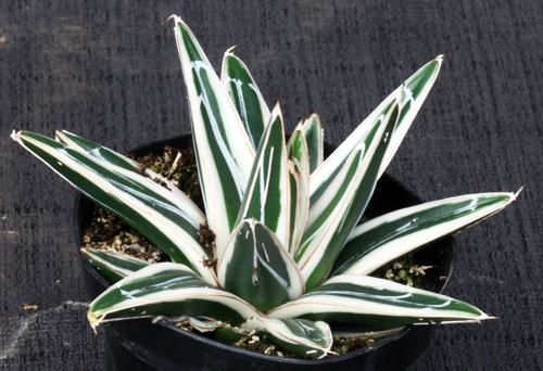 This form is one of the most desirable agaves from Mexico (Coahuila, Nuevo Leon, Durango). Our plants have short stiff, leaves with white marginal stripes (‘albimarginaga’ to some) and no spines. This form offsets. These plants are rooted offsets in 4-inch pots.