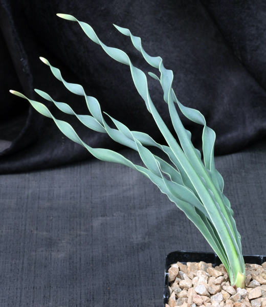 This species is widespread in the coastal parts of the Western and Northern Cape Province of South Africa, where it could be considered to be a winter-rainfall form of the more widespread Boophane disticha. A splay of distichous leaves arise from a bulb that typically is raised above ground; those leaves are green and glaucous. What makes this species so desirable besides the form are the intense red flowers that are produced in the spring. These plants are seedlings in 5-inch pots.