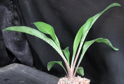 This may be an undescribed species of Ledebouria from Tanzania (WY 1205), but it sure looks like a form of L. revoluta. A strong rosette of purple-dotted leaves arises from a subterranean bulb. The flowers are numerous, small, and white with a strong and pleasant fragrance. These plants are seedlings in 4-inch pots.