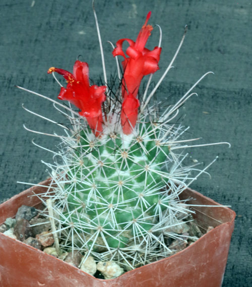 Although some consider this to be part of the genus Mammillaria, we keep it separate, in large part because of the large, red tubular flowers with irregular lips. This species is endemic to Baja California Sur, where it occurs sporadically in rocky terrain. Known for forming large clumps with relatively long creeping stems, this species is attractive for its flowers and stems. These plants are seedlings in 3-inch pots.