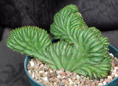This columnar species is from Ecuador and Peru, and it is known as the San Pedro cactus. This multi-fluted species typically has no spines or greatly reduced ones. The flowers are large and bright white, flowering in mid-summer. These plants are rooted crests in 8-inch pots.