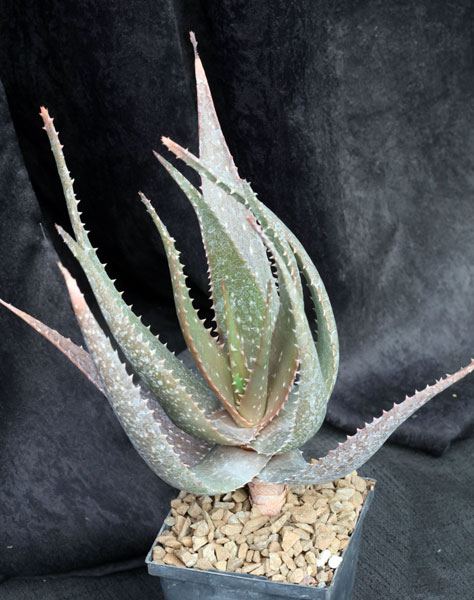 Due to problems with specimen labeling, this species as originally described was thought to be from Socotra, Yemen, hence the epithet. However, it actually is from the Cape peninsula near Cape Town, Western Cape Province of South Africa. It can have a short stem, but typically it produces light green leaves with prominent marginal teeth, betraying its close relation to Aloe arborescens. The flowers are red. These plants are open-pollinated seedlings in 5-inch pots.