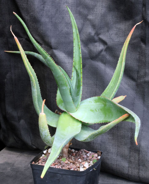 This species is from the northeastern provinces of South Africa. It is a medium to large species on a short stem bearing long, narrow leaves that are immaculate and green, turning reddish-purple in sun. The flowers are brown-yellow and have a shaving brush appearance owing to the dense inflorescence and long stamens. These plants are seedlings in one-gallon pots.