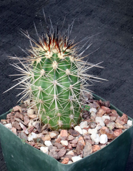 This species is known from only one canyon in Baja California, Mexico. It is known as Mexican Claret Cup and has been lumped as a subspecies into the Echinocereus polyacanthus group, but we keep it separate here. It has cylindrical stems bearing white spines with red-brown tips and offsets prolifically. The flowers are red and cup-shaped. These plants are seedlings in4-inch pots.