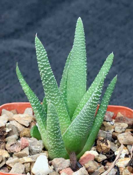 Like the name says, this is a small species of Haworthia that also is slow growing. It occurs in the Western Cape Province of South Africa in a winter-rainfall area, but this does not seem to affect its survival in the hot and summer-rainfall Tucson. Variety poellnitziana has longer, more slender leaves than the typical species. These plants are seedlings in 4-inch pots.