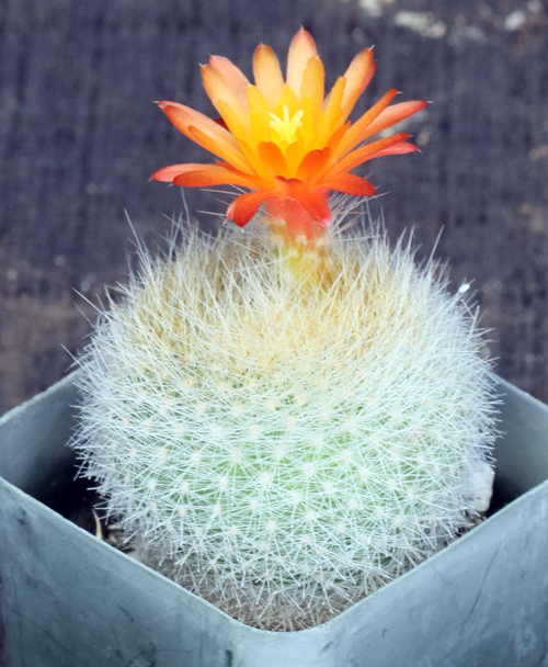 This small globose species is from Brazil. It has a light green body covered with yellowish-white spines. The flowers are red-orange. These plants are seedlings in 2-inch pots.