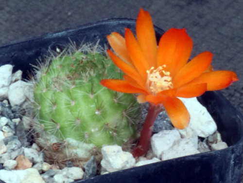 From Bolivia, this species is now considered part of Rebutia fiebrigii, a trashcan species with lots of things lumped into it. With its orange-red flowers and sparsely offsetting, medium green globose stems, this is a nice container plant. These plants are seedlings in 2-inch pots.
