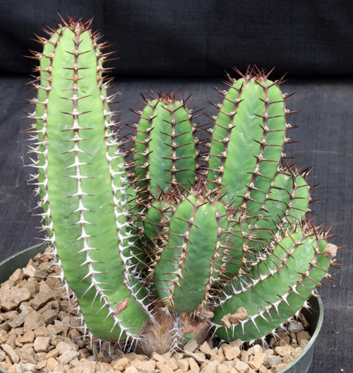 This candelabrum-form shrub is from the Northern Cape Province of South Africa and southern Namibia, with a distribution that roughly straddles the Orange River in much of its western arid and semiarid reaches. A resident of rocky hillslopes, this species typically has 5-angled stems that are yellow-green and densely spined with a continuous spine shield. The cyathia are yellow. These plants are seedlings in 8-inch pots.