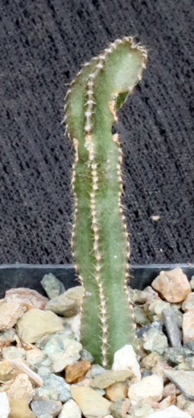 From Baja California, Mexico, this species has gray-green stems with small black spines. The stems are roughly four angled and arise from an underground tubers. The flowers are a white and open at night. These plants are seedlings in 2-inch pots.