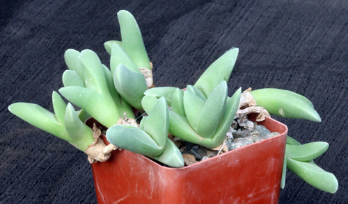 From the vicinity of Swellendam, where it grows in cracks in shale, this is a species with fine-felted leaves. They are thickened and in pairs with a hairy surface. The flowers are purple with a darker purple longitudinal stripe. These plants are seedlings in 4-inch pots.
