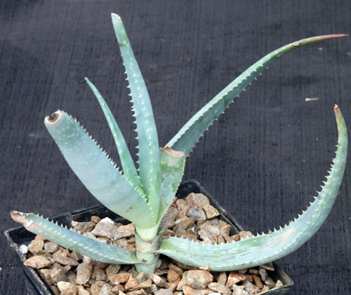 This species, from Cameroon and Zaire (Congo), has plants that occasionally offset but mostly have medium-sized, solitary rosettes. The leaves are blue-green with abundant faint-white spots and a pinkish-white margin with reddish-white marginal spines. The flowers are bright red. These plants are rooted offsets in 5-inch pots.