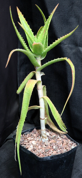 From the Northern Province of Tanzania, this shrubby species is one of the three species – the other two are A. fibrosa and A. morijensis – with significant fiber in the stems and leaves. Like many East African shrubby species, it features dark green leaves with substantial marginal teeth. The flowers are pink. These plants are rooted offsets in one-gallon pots.