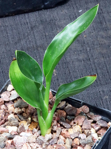 This species, known as the rush-leaved strelitzia or narrow-leaved bird of paradise, is from the Eastern Cape Province of South Africa. Its mature leaves are cylindrical and green with dull tips. The flowers superficially resemble birds and are predominantly yellow-orange. These plants are seedlings in 5-inch pots.