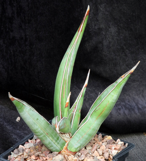 From northeastern Kenya, this highly valued species is unique among the Sansevieria. The fleshy leaves are blue-green with a horny white margin, and the tip is very sharp. Reportedly, this plant is dimorphic, shifting from a rosette form in juveniles and offsets to a distichous form in mature plants. These plants are rooted offsets in one-gallon pots.