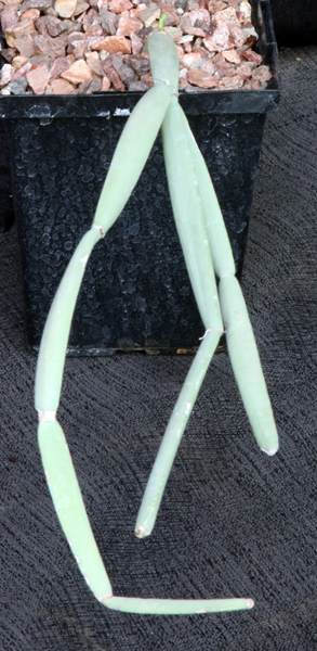 Widespread on the island of Socotra (Yemen), this species is a low shrub that grows mostly in the lower elevation alluvial fans or on mostly limestone slopes. Unlike many members of the genus Cissus, this one does not have climbing stems. The stems are flattened and gray-green in color, the leaves are small and inconspicuous, and the flowers are also inconsequential. These plants are rooted cuttings in 5-inch pots.