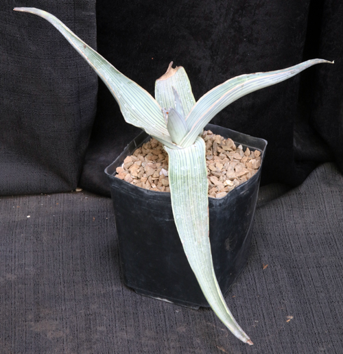 This species produces large, sparsely offsetting rosettes and is from the Northern Cape Province of South Africa and southern Namibia. The leaves are blue-gray with some pastel orange-red hints and have prominent stripes, making it one of the prettiest of the Aloes. The flowers are small in comparison to the size of the rosettes and are red. These plants are seedlings in one-gallon pots.