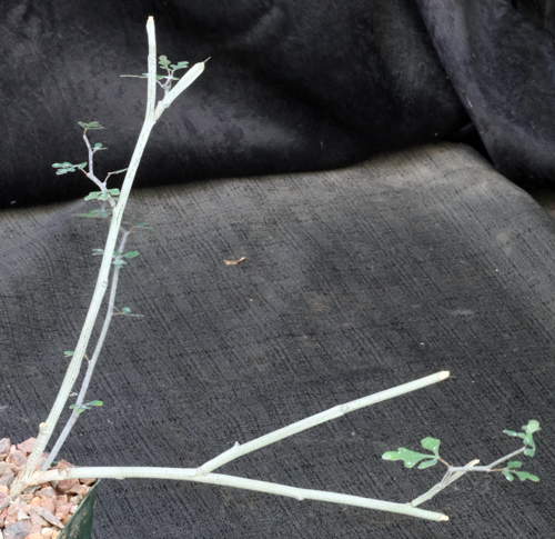From southwestern Madagascar, where many of our species occur naturally, this little Adenia is geophytic with mostly annual tendrils bearing three-parted palm-shaped leaves. Because of the color and round stems, it took us a while to separate these plants from Seyrigia gracilis, which grows in the same area. The flowers are inconspicuous but the plants may be either monoecious or dioecious. These plants are rooted cuttings in 4-inch pots.