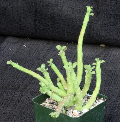 Monadenium ellenbeckii is a shrubby succulent from region of Ethiopia, Somalia, and northern Kenya. Characterized by its angled, brittle, and yellow stems, this species is slightly rhizomatous and forms numerous, brittle branches with time. The cymes are yellow. We offer rooted cuttings of this species in 4-inch pots.