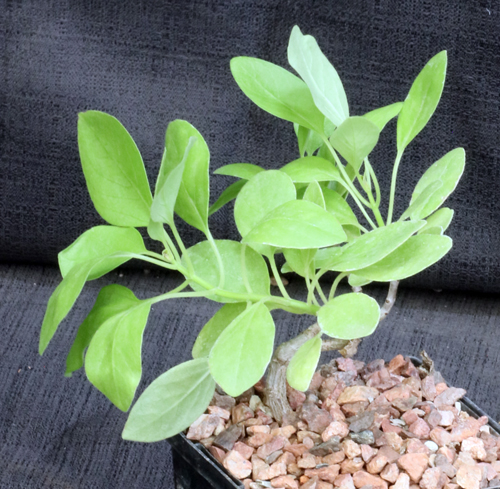 Plectranthus igniarius is a woody shrub in the mint family that is native to the Horn of Africa and the Arabian peninsula. These plants are propagated from material originally collected near Ignieribo, Somalia (Lav 23156). These plants are shrubs with a woody stem and succulent, light green-yellow leaves. The flowers are light blue and are strongly recurved. These plants are